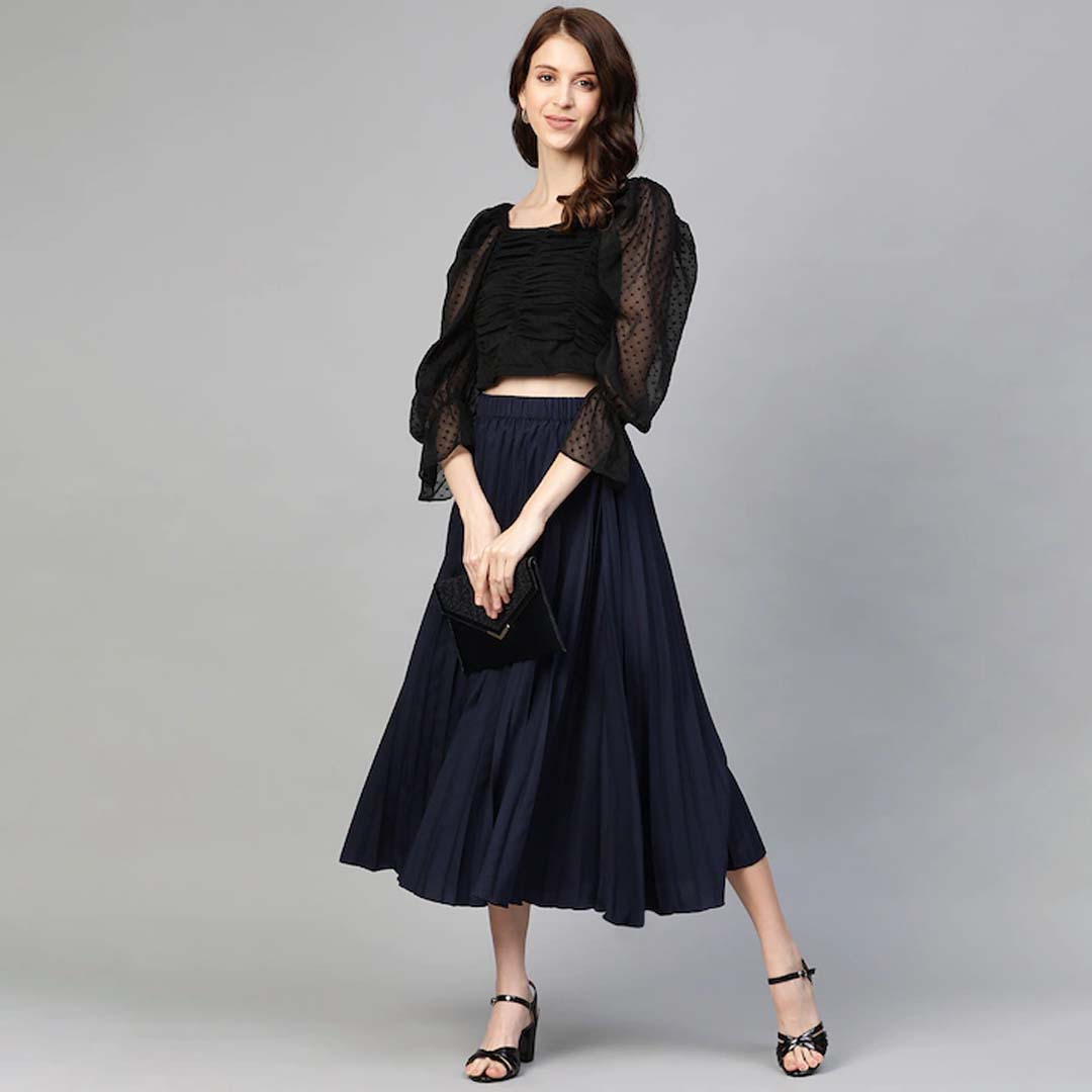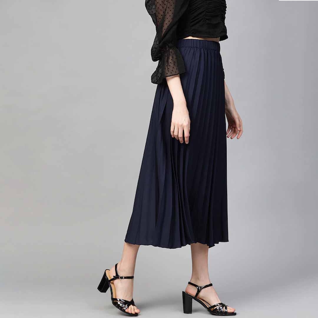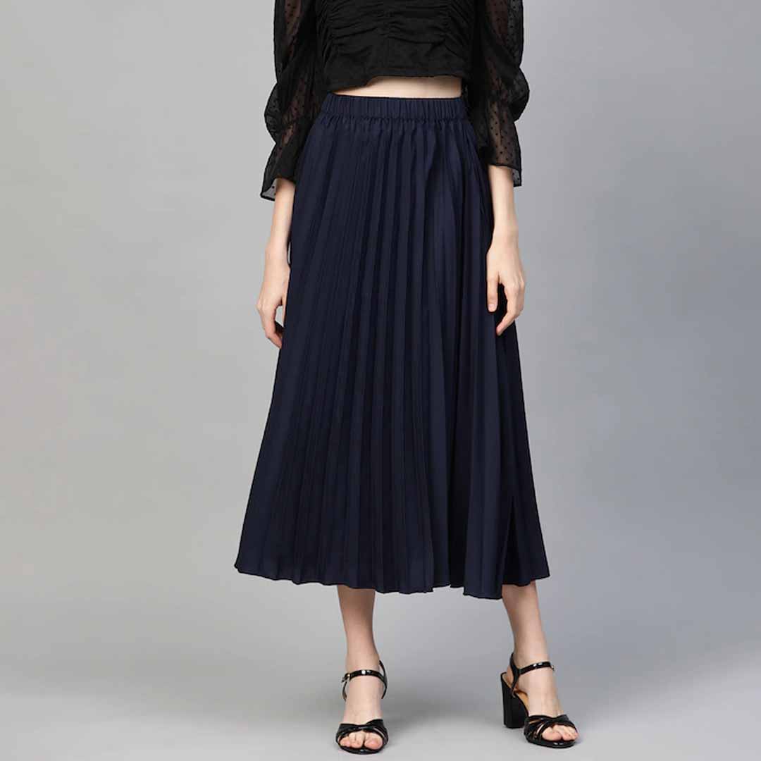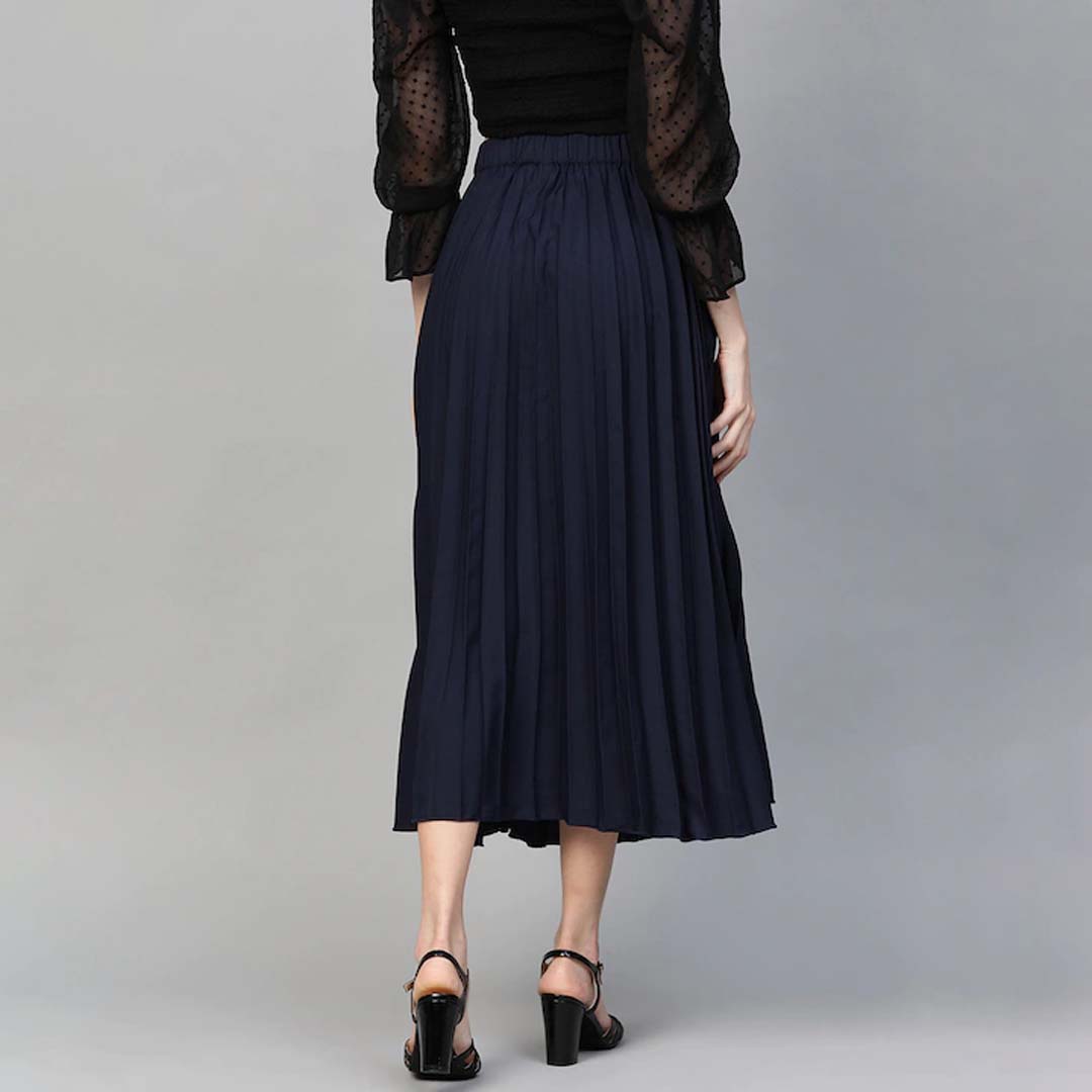 Navy Blue solid accordion pleated woven midi skirt, has a partially elasticated waistband, flared hem, button placket, and front slit